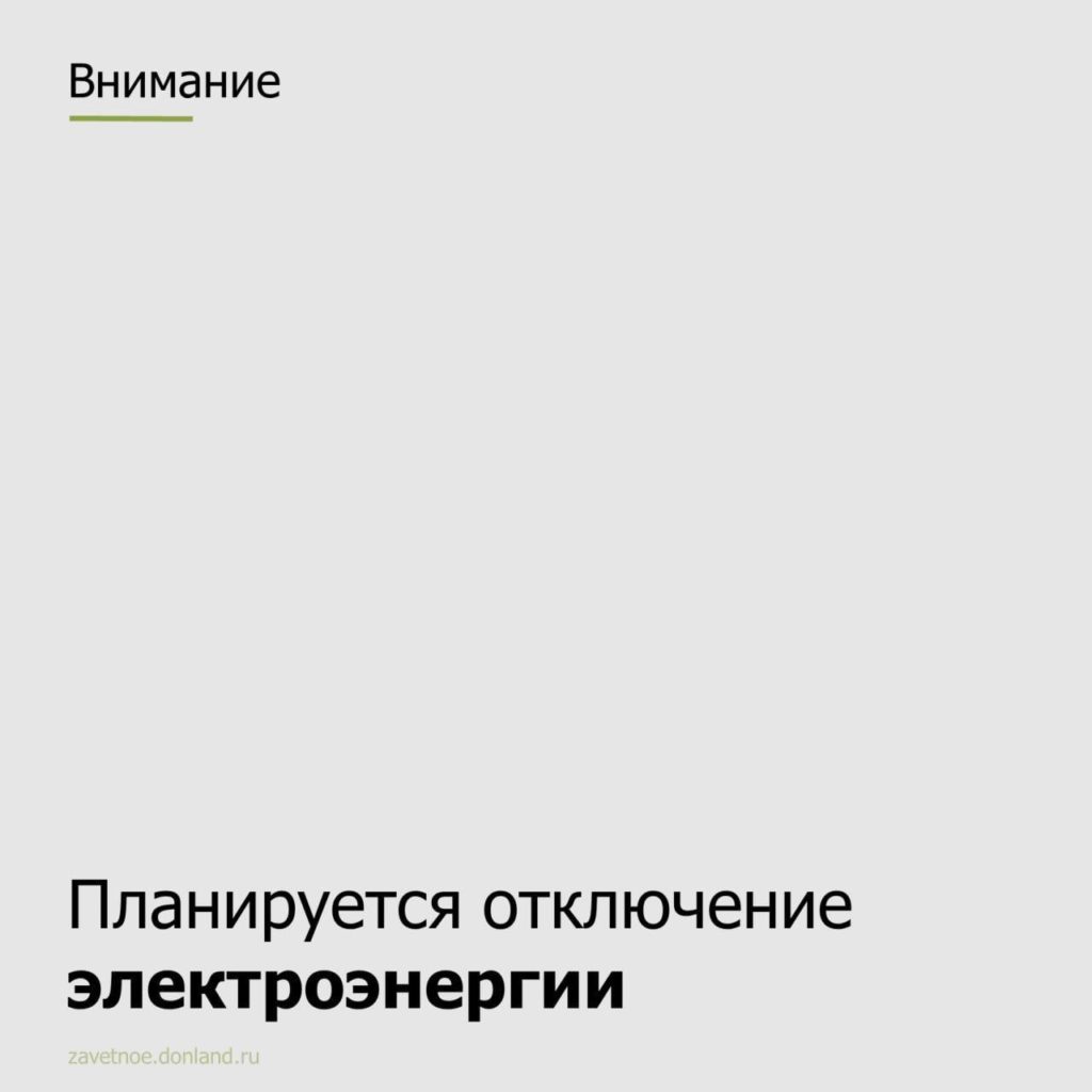 Границы отключения: с.Заветное — пер. Чкалова 18-24,23-31; пер. Панченко; ул. Гвардейская 2-22; пер. Книжный; ул.Мелиоративная; ул. Лесная; ул. Чехова; ул. Гоголя; ул. Низолина; ул. Ленина 14, 10А, 90-130; 15-37, 85А-105; ул.Кривошлыкова; пер. Буденного; ул.Нихаева 26-48, 3-21; ул. Чапаева; пер. Майский; ул. Герцена; ул. Фрунзе; ул. Южная; ул. Октябрьская; ул. Энгельса; ул. Гагарина; ул. Калинина; ул. Зеленая; ул. Мичурина 1-9, 2-22; ул. Степная; пер. Кирова; пер. Пушкина; ул. Дорошкевича 1-31; ул. Ломоносова 2-50, 3-33;