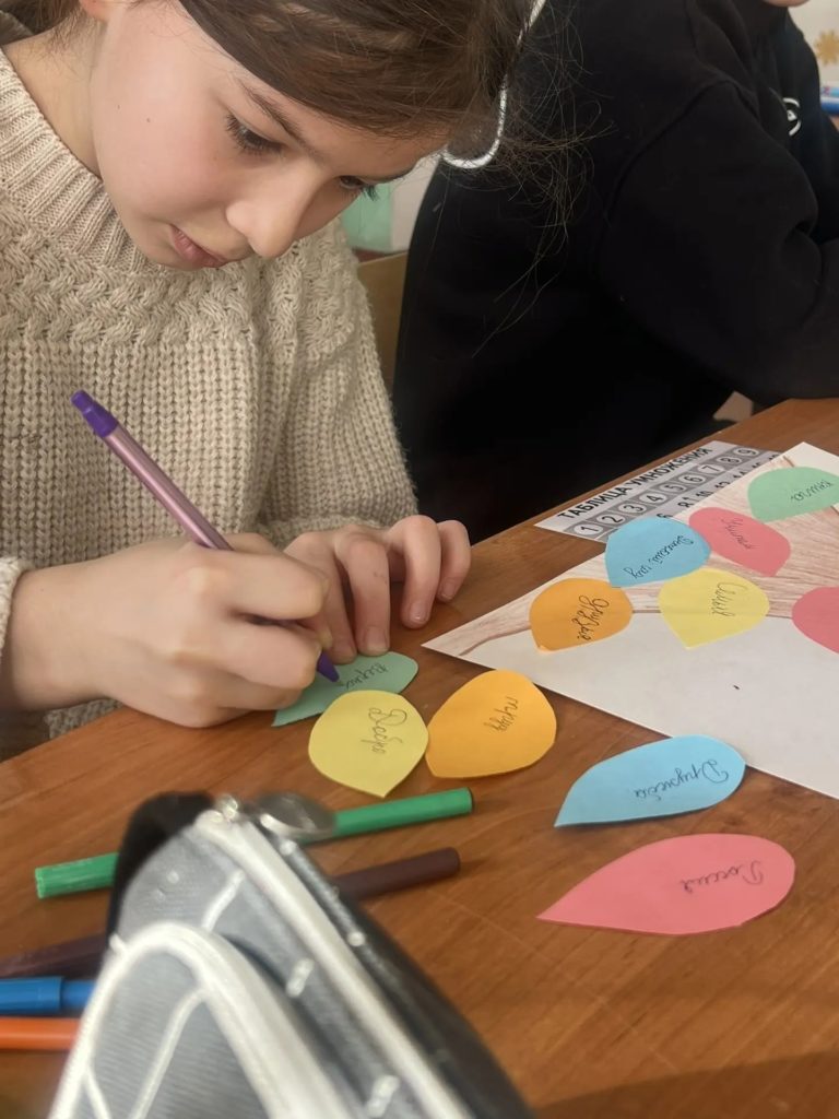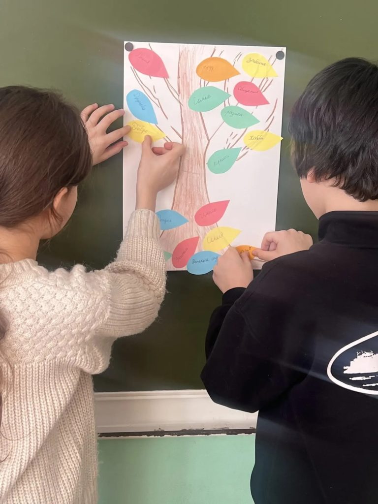 Ученикам предложили отразить свои внутренние ориентиры — написать на листочках те ценности, которые они бережно хранят в сердце, и разместить их на кроне символического дерева.