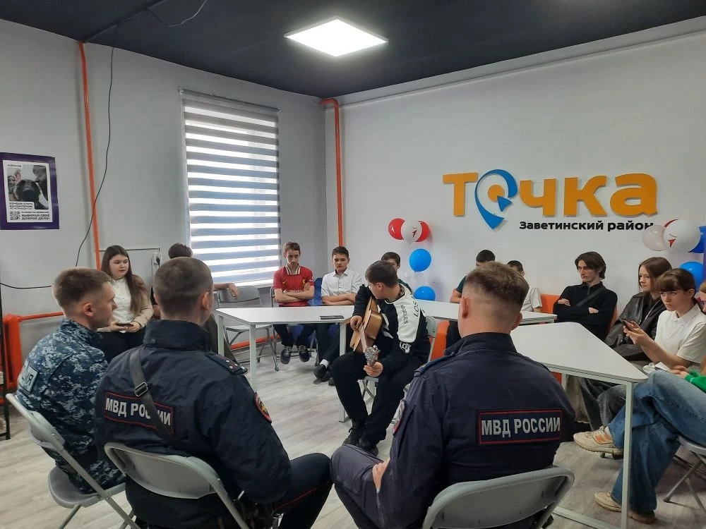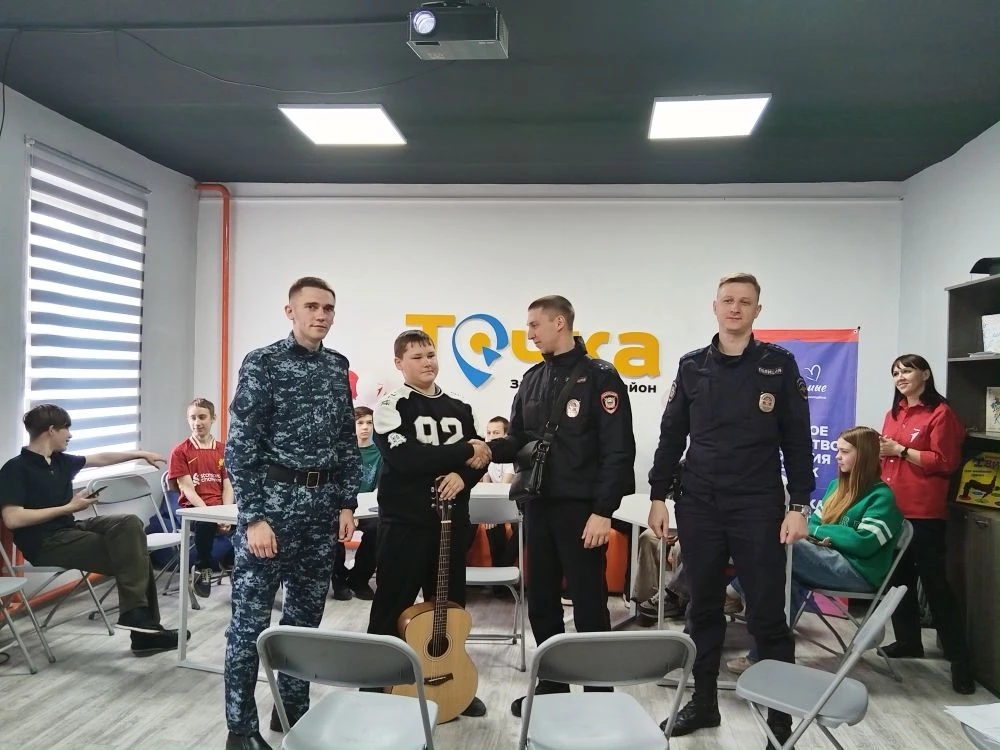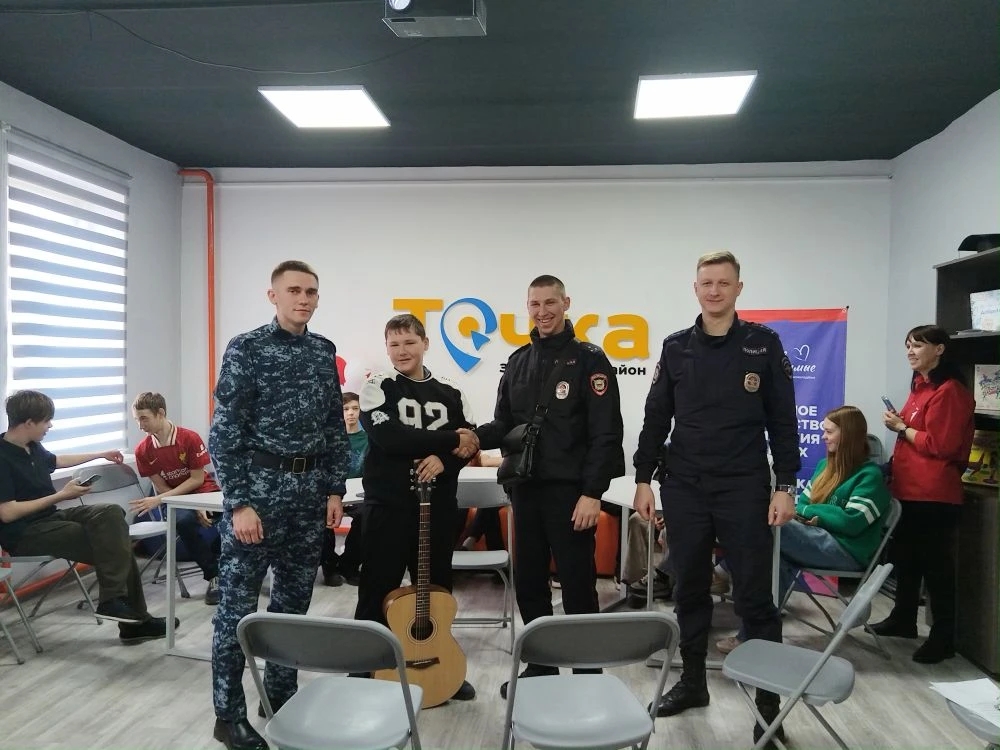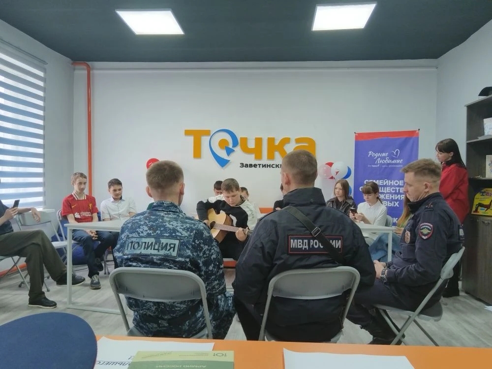 Творческий момент: в благодарность за содержательные беседы один из подростков исполнил песню на гитаре для сотрудников полиции и представителей казачества.