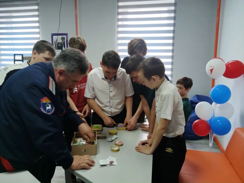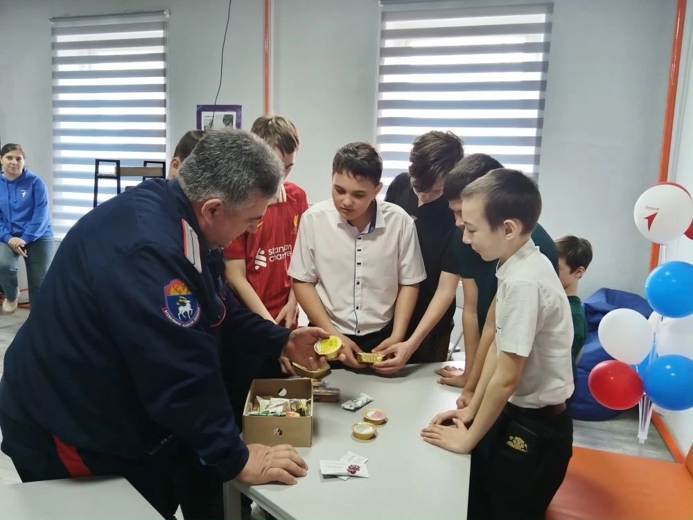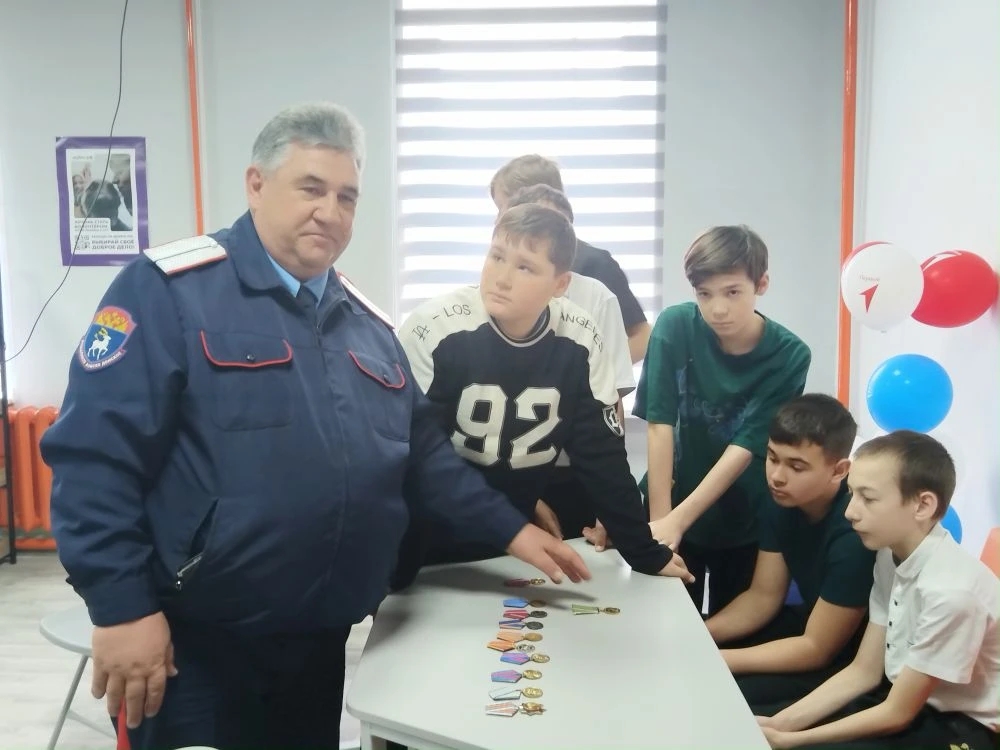 Рассказ о гуманитарной миссии волонтёров от Гайворонского В. А., первого заместителя атамана Заветинского юрта. Владимир Анатольевич также показал подросткам свои заслуженные награды,