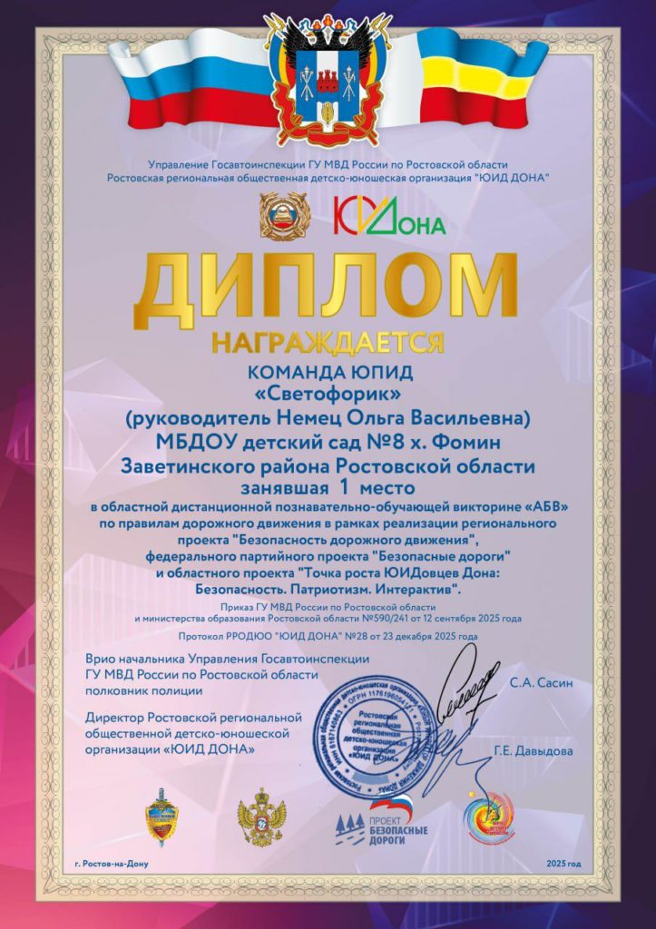 Заслуженная победа: команда ЮПИД «Светофорик» из детсада № 8 х. Фомин под руководством Немец О.В. уверенно заняла 1 место в областной познавательной викторине «Автомобиль. Безопасность. Велосипед» — настоящем испытании знаний, смекалки и командного духа.