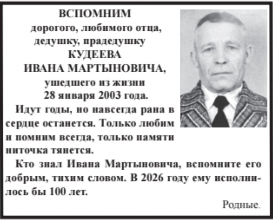 Новости Идут годы, но навсегда рана в сердце останется 28.01.2026 19:35 Восход 0 220 Вспомним Кудеева Ивана Мартыновича Теги: