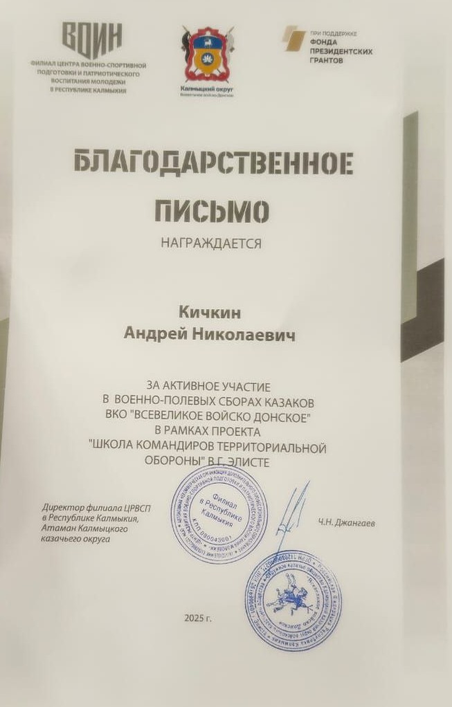 С 7 по 9 ноября 2025 года на базе Центра «Воин» Республики Калмыкия прошли инструкторко-методические сборы с казаками окружных казачьих обществ ВКО «Всевеликое войско Донское».
