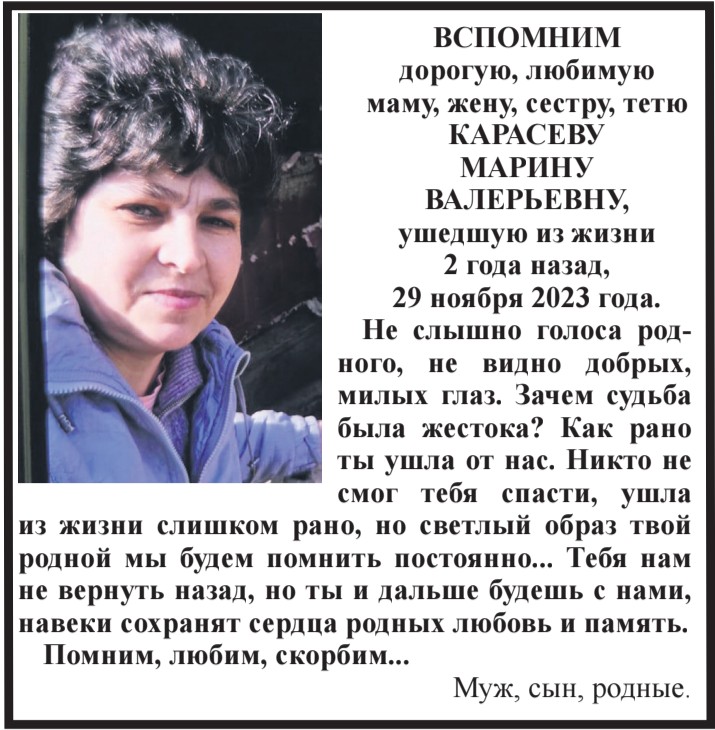 Новости Не слышно голоса родного 29.11.2025 12:53 Восход 0 430 Вспомним Карасеву Марину Валерьевну. Теги: