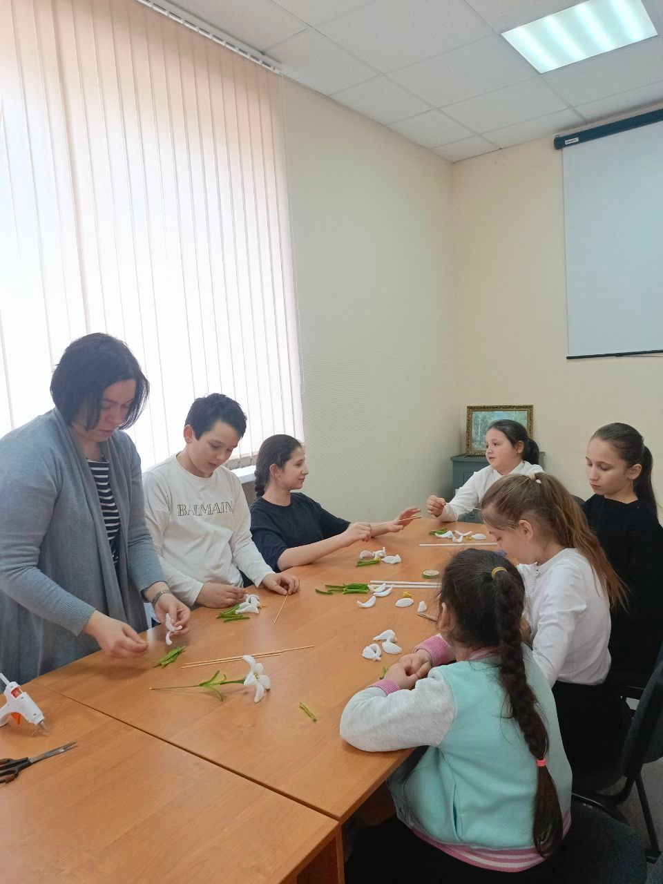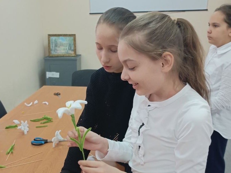 Целью занятия стало изготовление лилий — цветов, издавна олицетворяющих чистоту помыслов, нежность и обновление природы. Ребята вкладывали в свои работы тепло души и частицу вдохновения: шаг за шагом на рабочих столах расцветали необычные рукотворные композиции, каждая из которых была по‑своему уникальна.