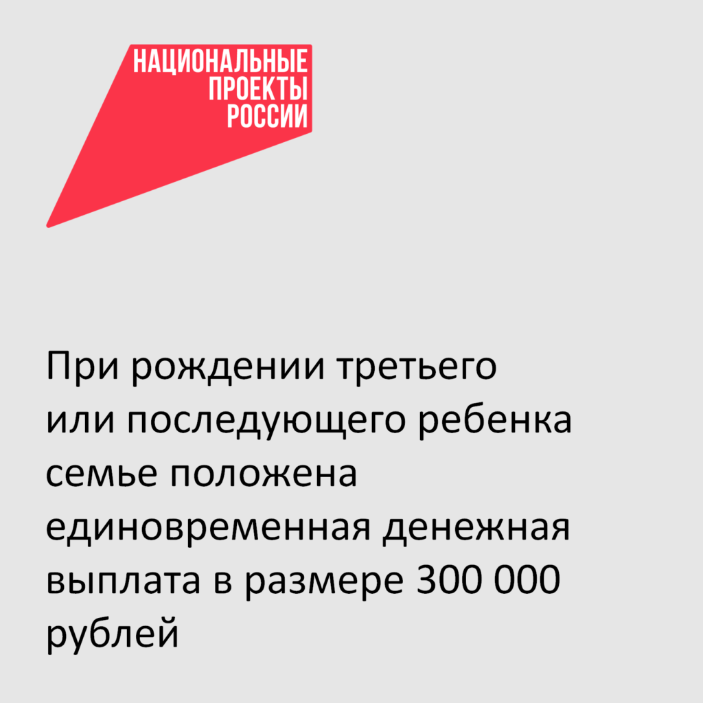 С января текущего года в рамках национального проекта «Семья» многодетным семьям предусмотрена новая мера социальной поддержки в виде предоставления единовременной денежной выплаты в связи с рождением в период с 01.01.2025 по 31.12.2027 третьего или последующего ребенка в размере 300 тыс. руб.