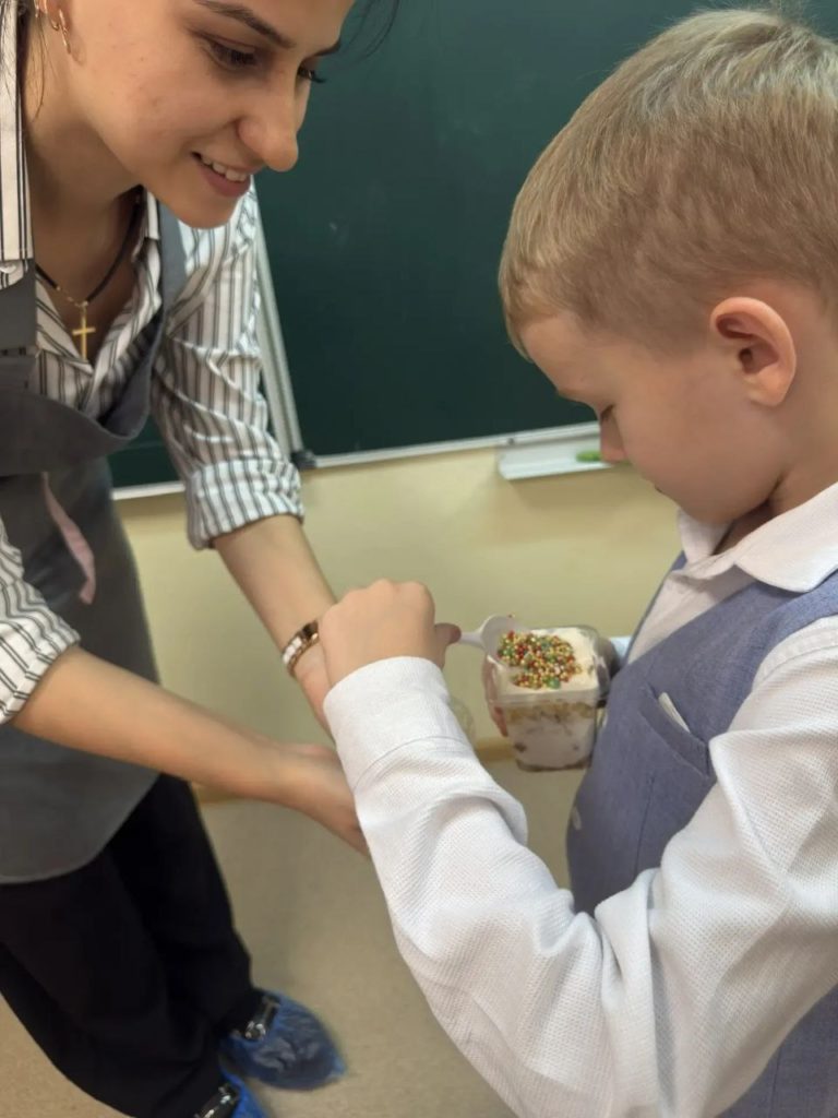 Ребята с большим интересом погрузились в мир кондитерского искусства. Трайфл — десерт, который покоряет своей многослойностью: нежный бисквит, ароматная банановая начинка и воздушный крем‑чиз на основе сливок.
