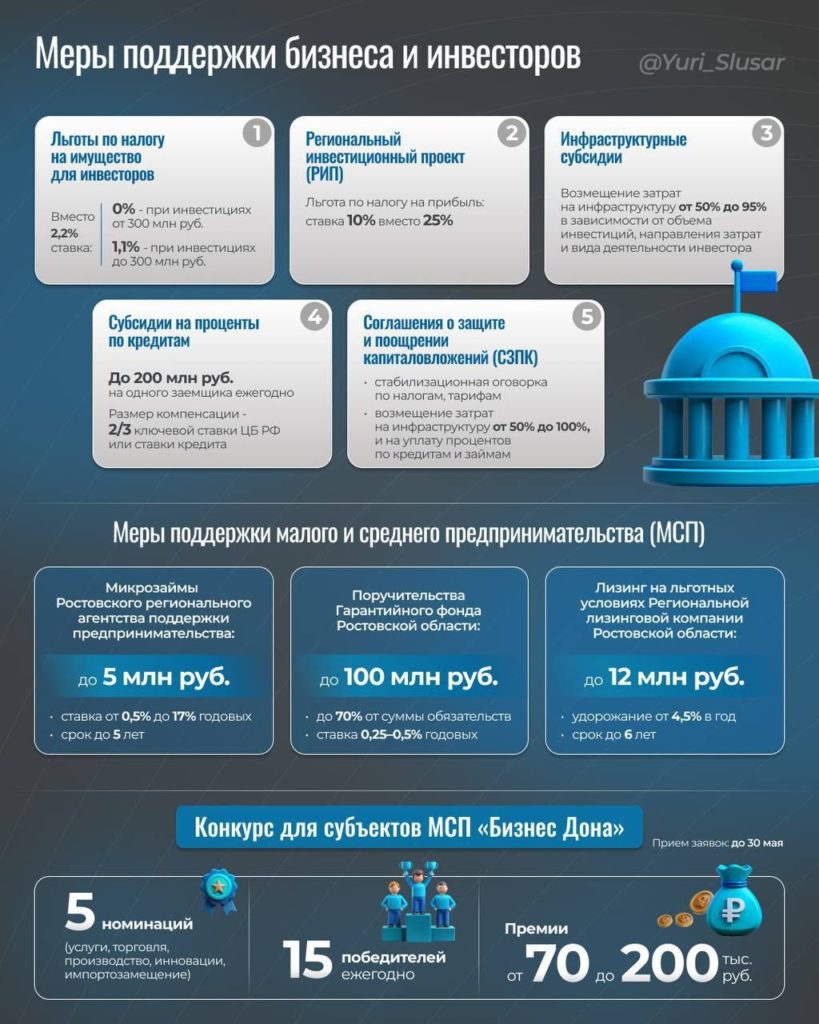 Вместе с тем Ростовская область на постоянной основе оказывает поддержку инвесторам. Так, им положены субсидии на возмещение части затрат на уплату процентов по кредитам, «инфраструктурные» субсидии. Для них предусмотрены и налоговые льготы. Их капиталовложения защищены и поощрены. А также в регионе реализуется система предоставления им земельных участков в аренду без торгов.