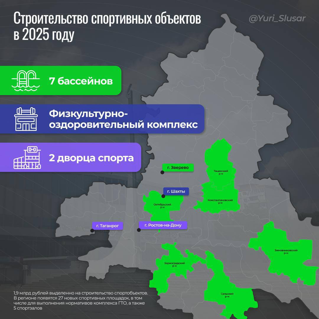 Глава Донского региона Юрий Слюсарь сообщил, что в области возведут новые спортивные объекты. На эти цели будет выделено свыше 1,9 млрд рублей.