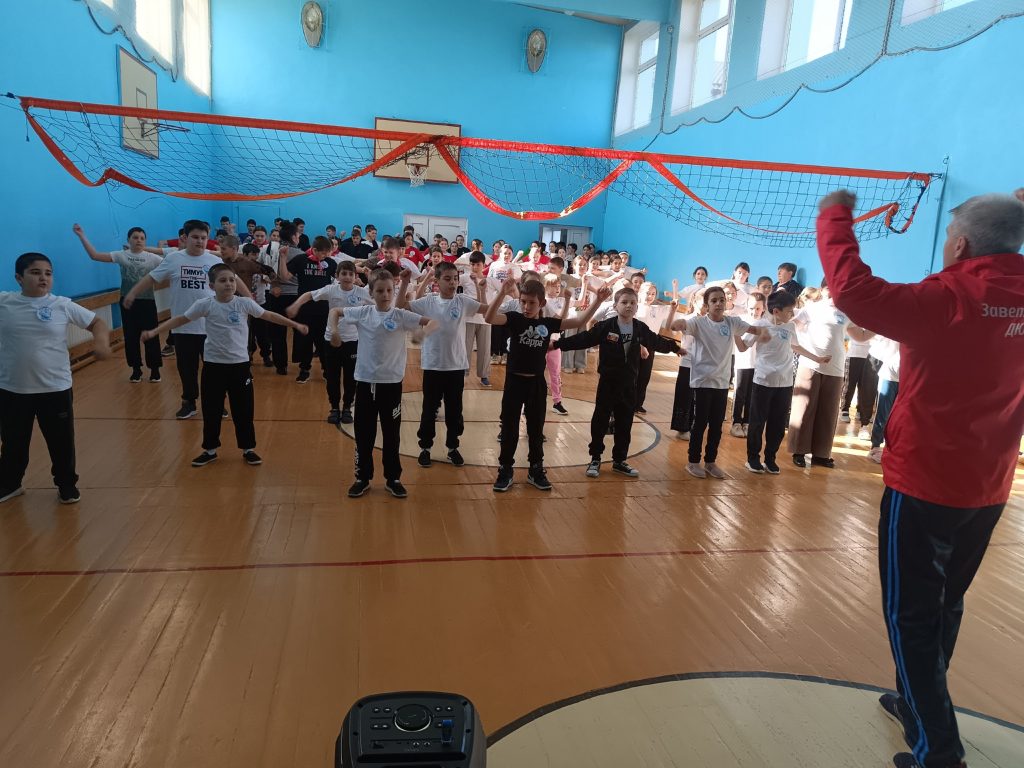 Под руководством опытного тренера‑преподавателя А. Р. Ткаченко школьники с 1‑го по 11‑й класс выполнили комплекс бодрящих упражнений.