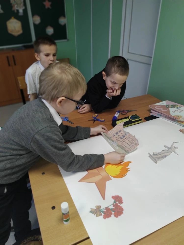 А потом — творчество…Дети вместе создали аппликацию «Город-герой» — каждый вложил в нее частичку души. Звезды, флаги, силуэты солдат, Волга, пламя и ладони, сложенные в символе памяти — все это стало частью одной большой, светлой композиции.