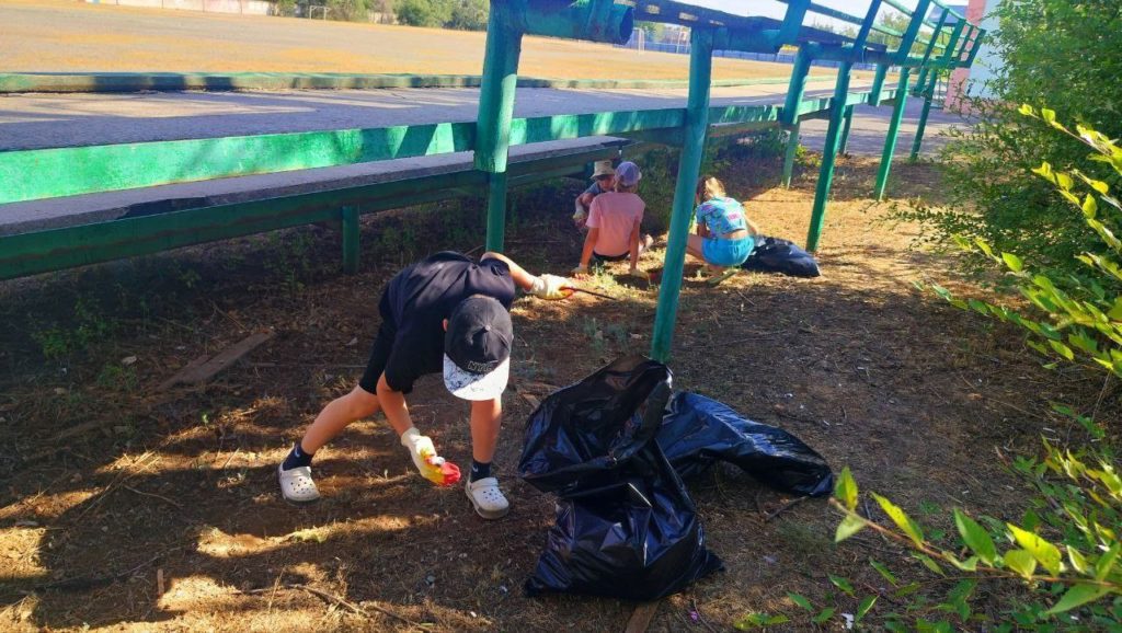 Участники «Зелёного отряда» Движения Первых нашего района провели субботник на стадионе села Заветного и прилегающей к нему территории. Это задание регионального проекта «Экочемпионат».