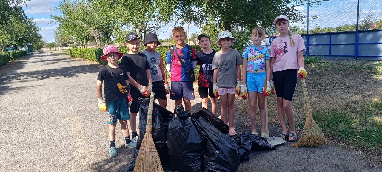Участники «Зелёного отряда» Движения Первых нашего района провели субботник на стадионе села Заветного и прилегающей к нему территории. Это задание регионального проекта «Экочемпионат».