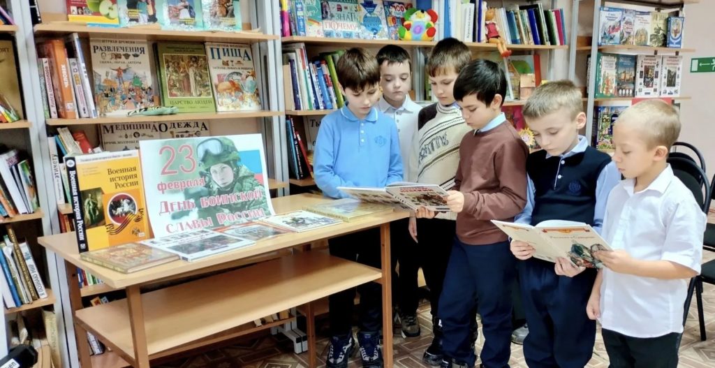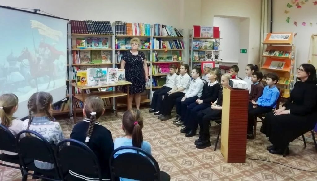 Сотрудники библиотеки радушно встретили ребят. Библиотекарь Т.И Мудрая предложила детям совершить увлекательное литературное путешествие «Герои сквозь века» и провела викторину «Защитником быть – Родине служить».