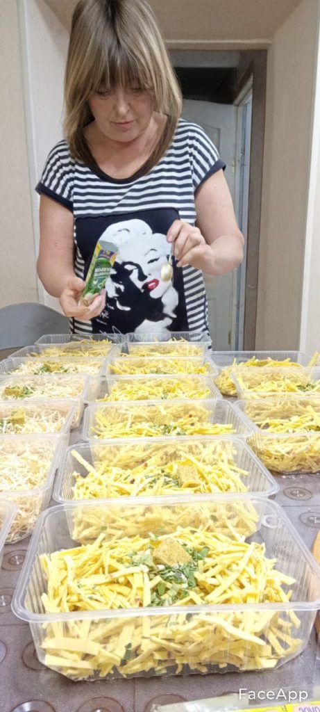На фронт наши волонтеры отправляют вкусную и ароматную мазанку, а также домашнюю лапшу быстрого приготовления, которую обрабатывают в духовке до такого состояния, что при заливке кипятком через несколько минут она уже готова к употреблению.